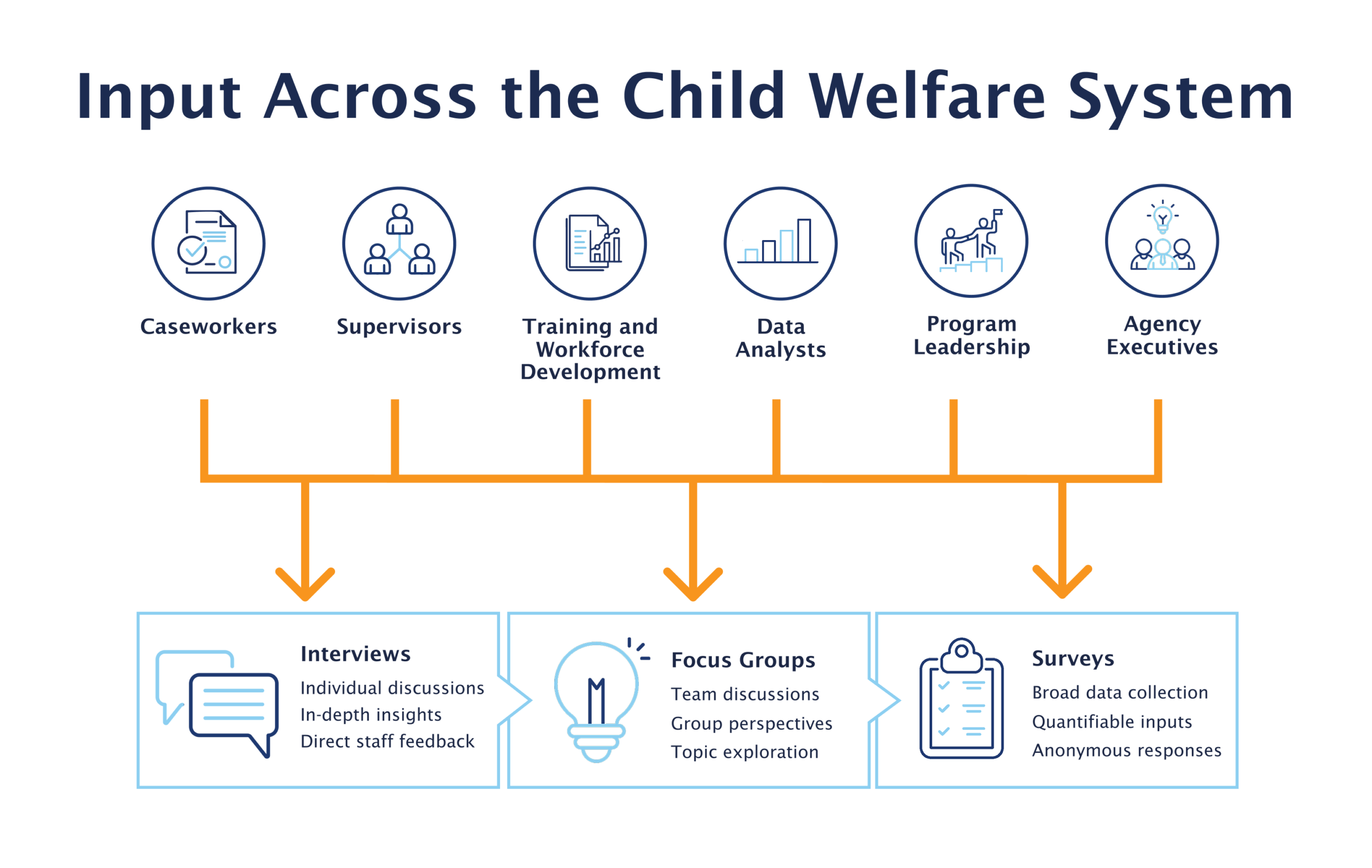 To fully understand the system, we gathered perspectives from a range of staff, including caseworkers, supervisors, training leaders, data analysts, and agency executives. We gathered this input using interviews, focus groups, and surveys. We also met with leadership to dive deeper into initiatives and programs supporting child welfare improvement.